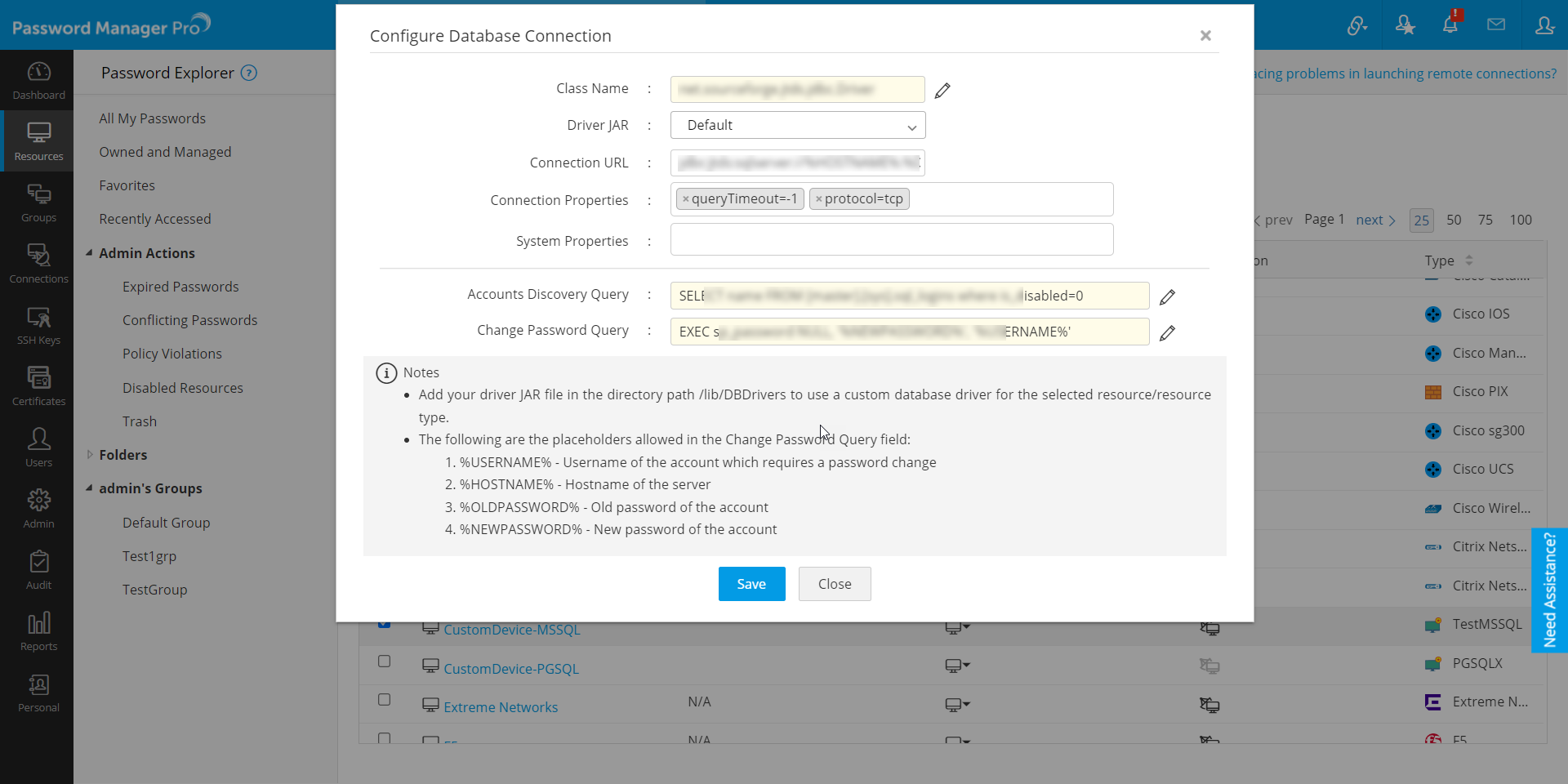 Users assigned with the above privileges can configure and manage customized database resource types and manage JDBC properties accordingly via Password Manager Pro.