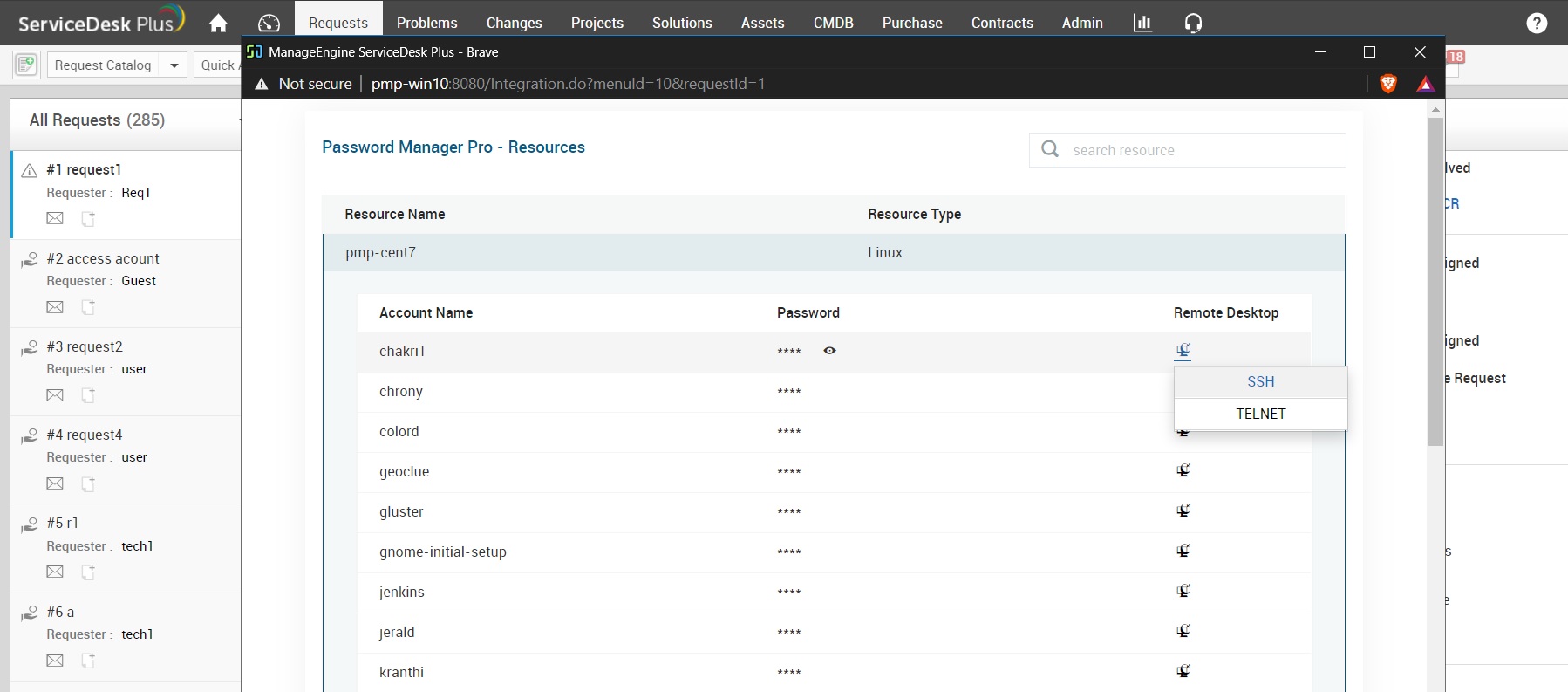Technicians using SDP often need to access target machines (or resources) manually to resolve issues, which involves security-related challenges, such as sharing sensitive passwords for authentication, etc., especially while using the privileged accounts. They also had the pain of jumping between machines to perform different tasks. With this integration, accessing the remote systems from the ServiceDesk Plus portal is just a click away for the Technicians. Administrators can now provide the advantage of secure remote access to the target machines (or resources) only to the authorized Technicians, without sharing the credentials. The Technicians can remotely access the target endpoints (or resources) from the ServiceDesk Plus portal without having to log in to PMP each time to fetch the credentials.