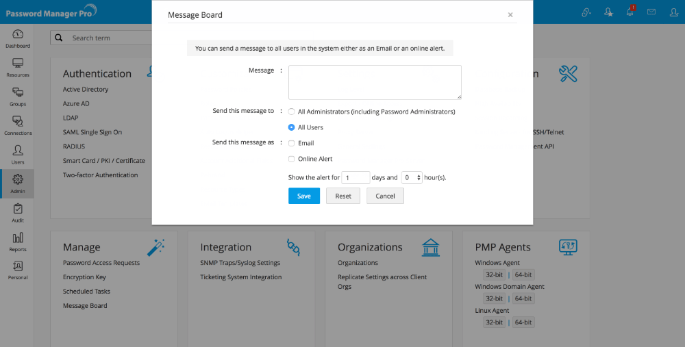 If you want to display a common message to all Password Manager Pro administrators or users, you can do so from Password Manager Pro. The 'Message Board' feature helps to achieve this. For example, whenever Password Manager Pro server is down for a few hours due to maintenance you can intimate this information to all the administrators/users using this feature. The common message entered by you will be displayed to all the users/administrators as you decide.
