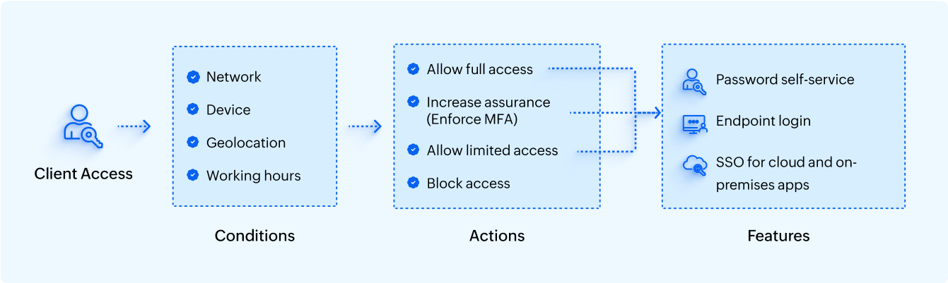 For example, if a user logs in to their device at an unusual time or from a different place, they may be asked to verify their identity with additional authentication factors. If the user's login activity continues to appear suspicious, they will be denied access. Conversely, to enhance the user experience, the MFA process may sometimes be skipped for users when no risk is detected.