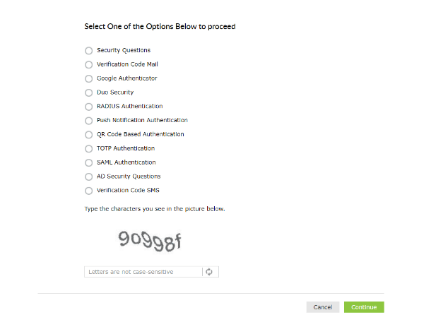 - Clicking this link will open the password reset portal. Users are required to prove their identity through any of the enforced authentication methods, such as SMS-based one-time passwords (OTPs), email-based OTPs, Google Authenticator, Duo Security, and RSA SecurID.