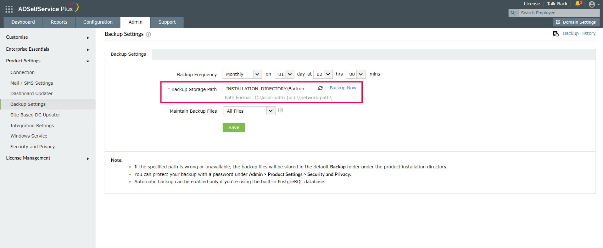 - Log in to the ADSelfService Plus admin portal and navigate to Admin > Product Settings > Backup Settings.