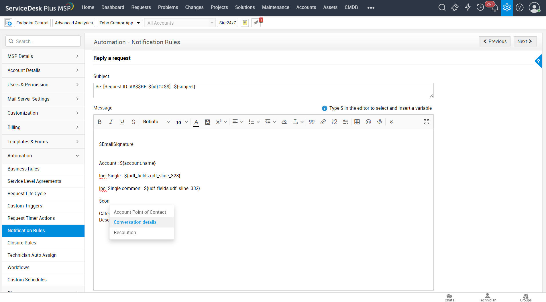 ManageEngine ServiceDesk Plus-MSP allows you to send notifications to requesters and technicians through notification rules. The notifications can be of two types: email and SMS. These notification modes can be set across various modules of the application, such as requests, problem, change and solution. Any default actions that you might want to perform when the state of any item changes can also be defined.