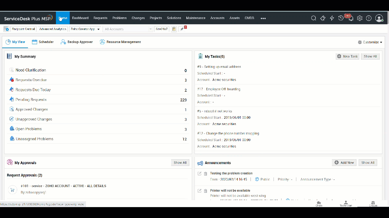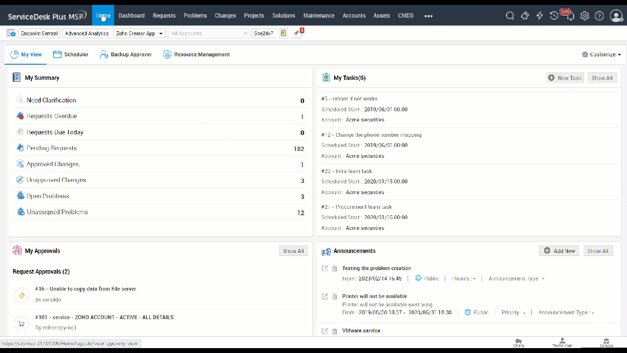 The My Approvals widget on the home page lists requests that require your approval action. You can approve or reject approvals directly from this widget. Approval requests are grouped based on modules.