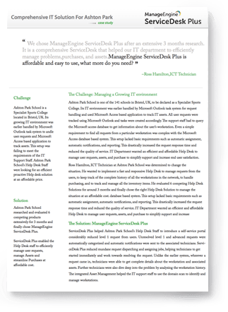 Ashton Park School is one of the 141 schools in Bristol, UK, to be declared as a Specialist Sports College. Its growing IT environment was managed by loosely coupled Microsoft Outlook task system for request handling and used a Microsoft Access based application to track IT assets. All user requests were tracked using Microsoft Outlook and tasks were created accordingly. When a request came in, the Help Desk staff had to query the Microsoft Access databases to pull out the workstation details associated to the requestor. In such an environment, even a simple requirement to find all requests from a particular workstation was complex. This drastically increased the request response time and reduced the quality of service.