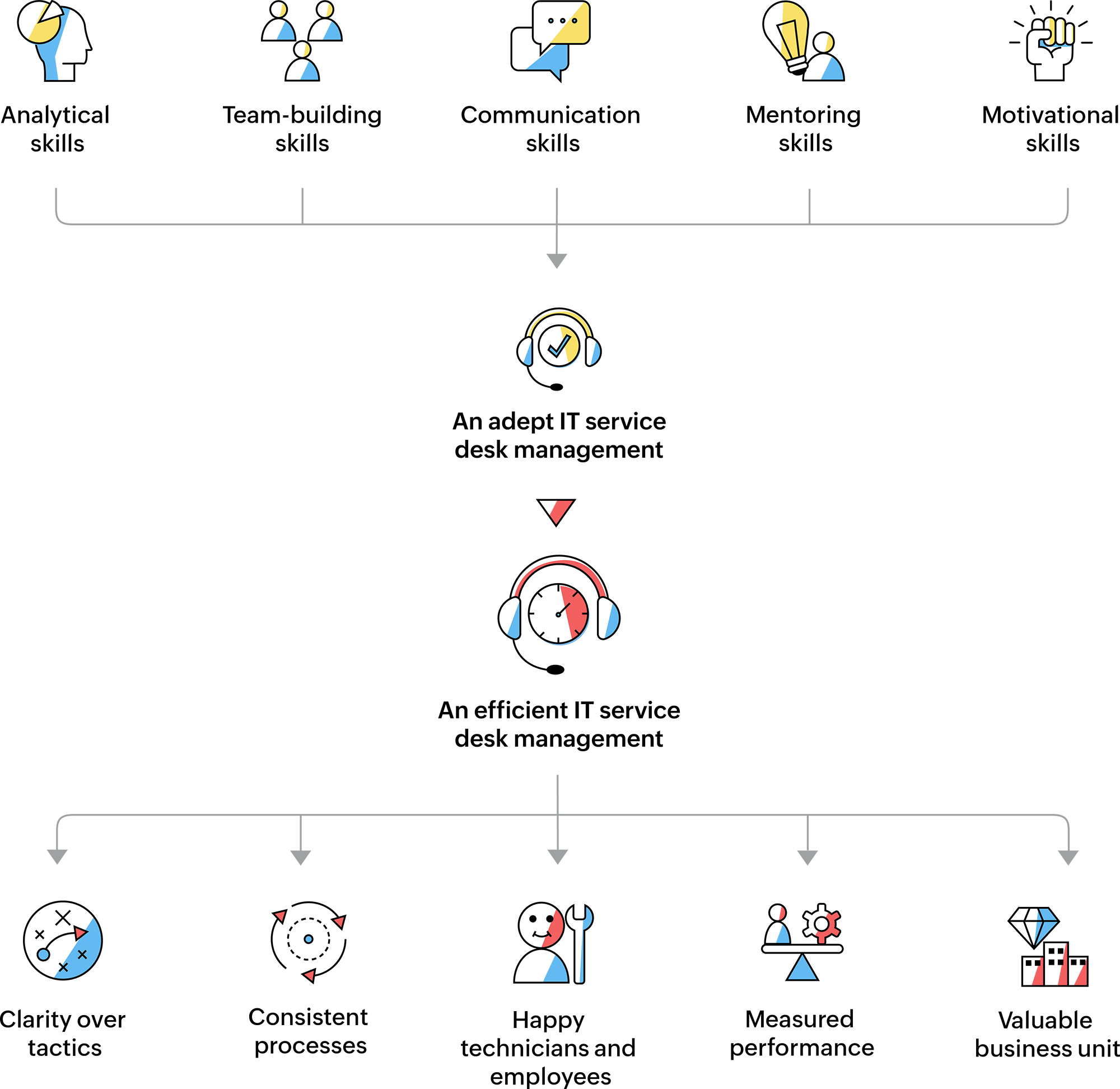 Service desk managers have to roll up their sleeves for any high-impact incidents such as infrastructure issues. They must have the technical skills to visualize the issue, gather data, and resolve it.
