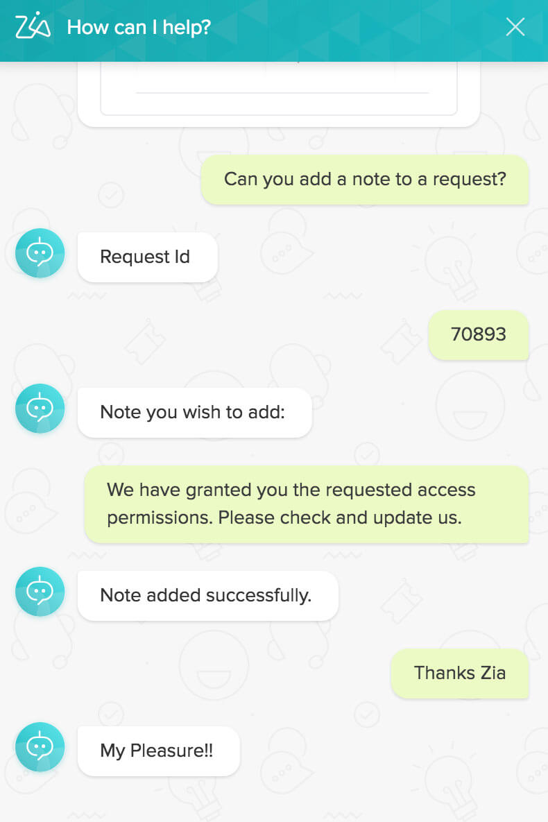 • Zia, the AI-based virtual assistant from Zoho, can be the first point of contact for end users. This frees technicians from performing mundane tasks, while end users receive help creating tickets and find solutions faster.