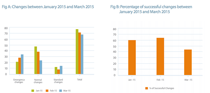 As shown in Fig A, the standard changes were few, while the normal and emergency changes continued to increase. In addition, there were several failed changes, and the business started losing hope on IT.