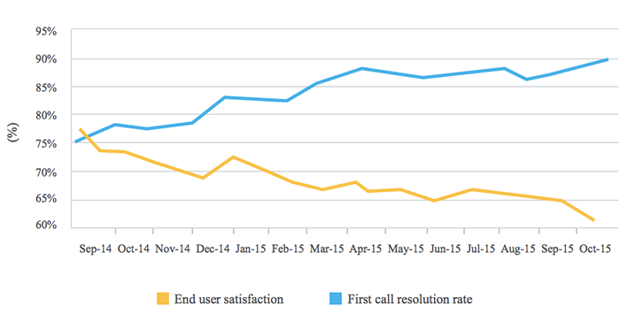 Sometimes IT helpdesk call center agents rush to close tickets during the first call, even without accurate resolutions. Such cases can lead to first call resolution rates rising, while end user satisfaction rates drop drastically, as depicted in the following graph.