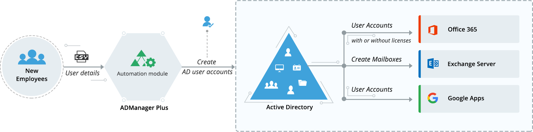 Provisionnez simultanément les comptes utilisateurs dans Active Directory, Office 365, Exchange, Skype Entreprise/Lync et Google Workspace.