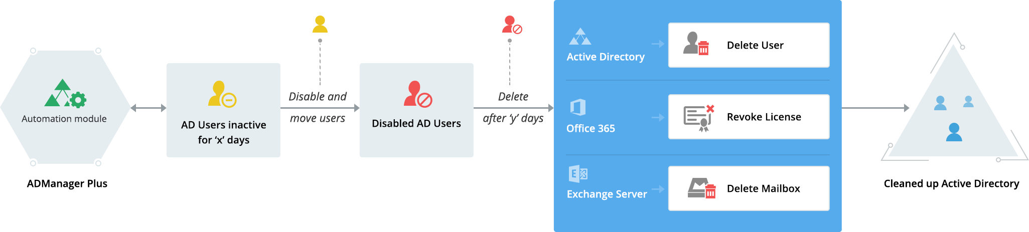 Automatisez le nettoyage d'AD en utilisant une stratégie d'automatisation pour définir quand et dans quel ordre les activités de nettoyage doivent être effectuées. Par exemple, configurez une stratégie d'automatisation de sorte que les utilisateurs inactifs (tels que fournis par le rapport des utilisateurs inactifs) soient désactivés, puis déplacés vers une autre UO au bout de x jours, et finalement supprimés au bout de y jours. Implémentez cette stratégie d'automatisation dans une automatisation et spécifiez la fréquence d'exécution de l'automatisation.