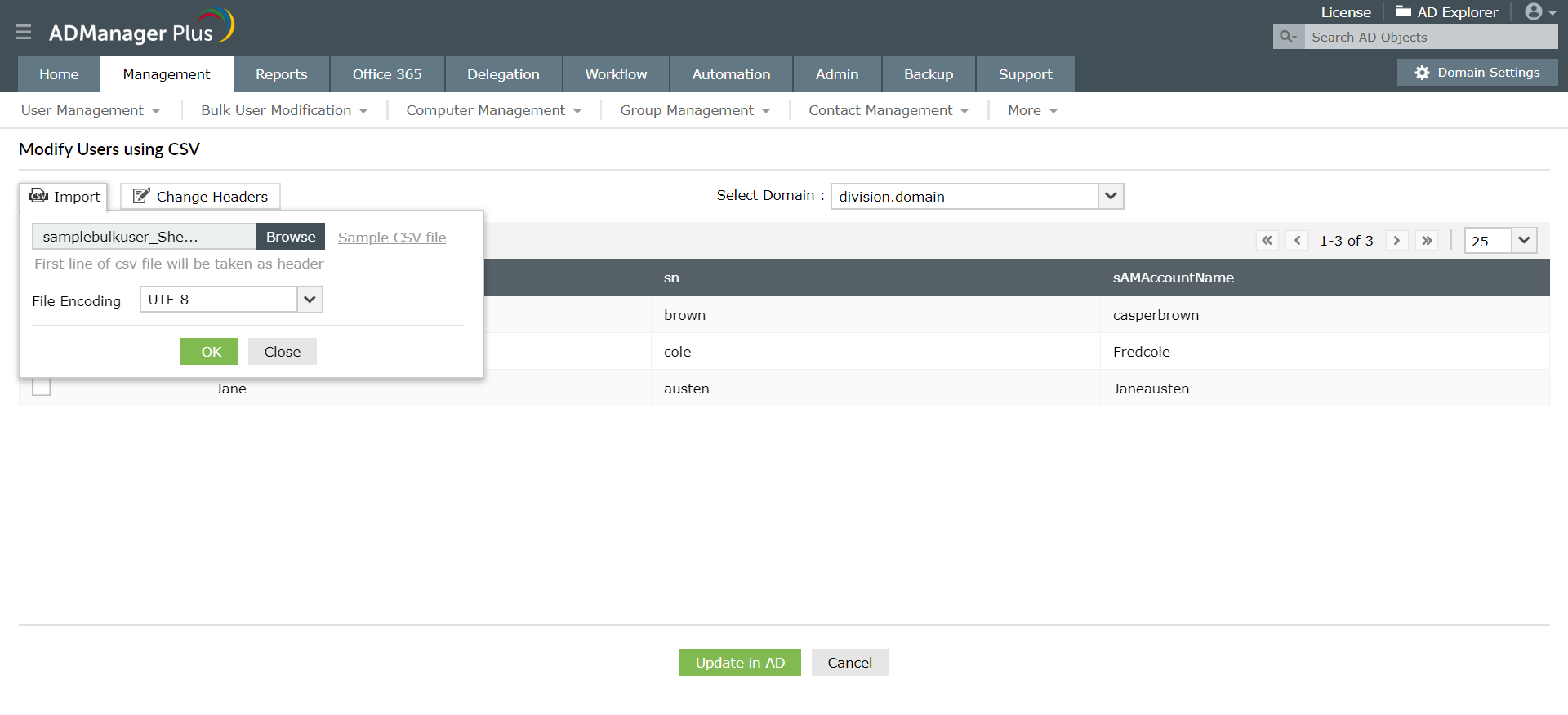 ADManager Plus permet de soulager les administrateurs de systèmes grâce à ses actions de création ou de modification d'utilisateurs et à sa capacité d'importation CSV. Après avoir importé le fichier CSV dans ADManager Plus, les administrateurs peuvent utiliser des modèles pour standardiser les valeurs des attributs en fonction des stratégies de leur organisation. Enfin, l'outil valide les informations relatives à l'utilisateur, et le changement correspondant est effectué dans Active Directory.