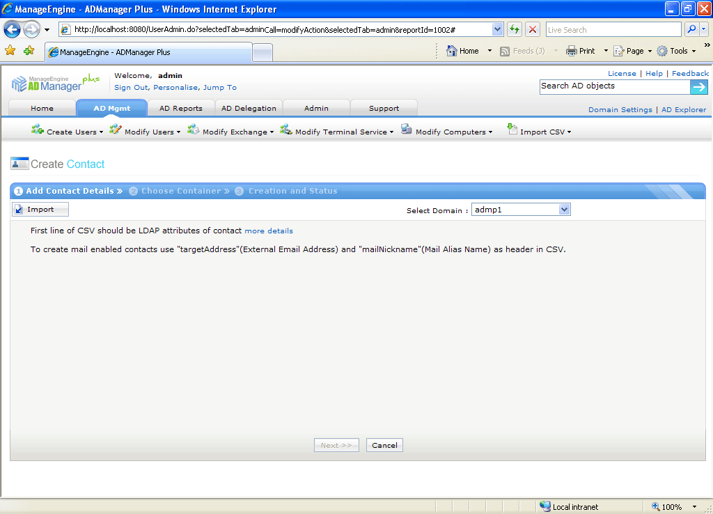 ADManager Plus offre une fonctionnalité de création de contacts en masse. Elle permet à un administrateur de créer de nombreux contacts standards et à extension messagerie par importation depuis un fichier CSV. Elle élimine le processus chronophage de créer chaque contact individuellement et d'utiliser des outils de commande. La gestion des contacts Active Directory devient ainsi plus simple, fiable et flexible.