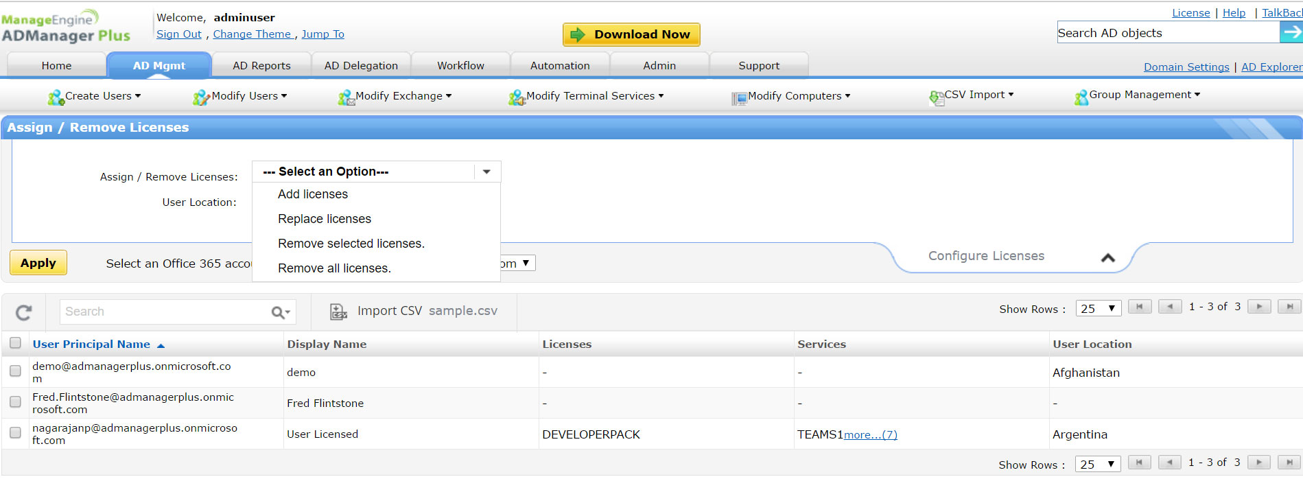 ADManager Plus est un outil Web qui vous permet de gérer facilement les licences Office 365 de vos utilisateurs sans écrire de scripts PowerShell, comme vous pouvez le voir dans la Figure 1. Vous pouvez gérer ces licences individuellement ou en bloc en seulement quelques clics de souris.