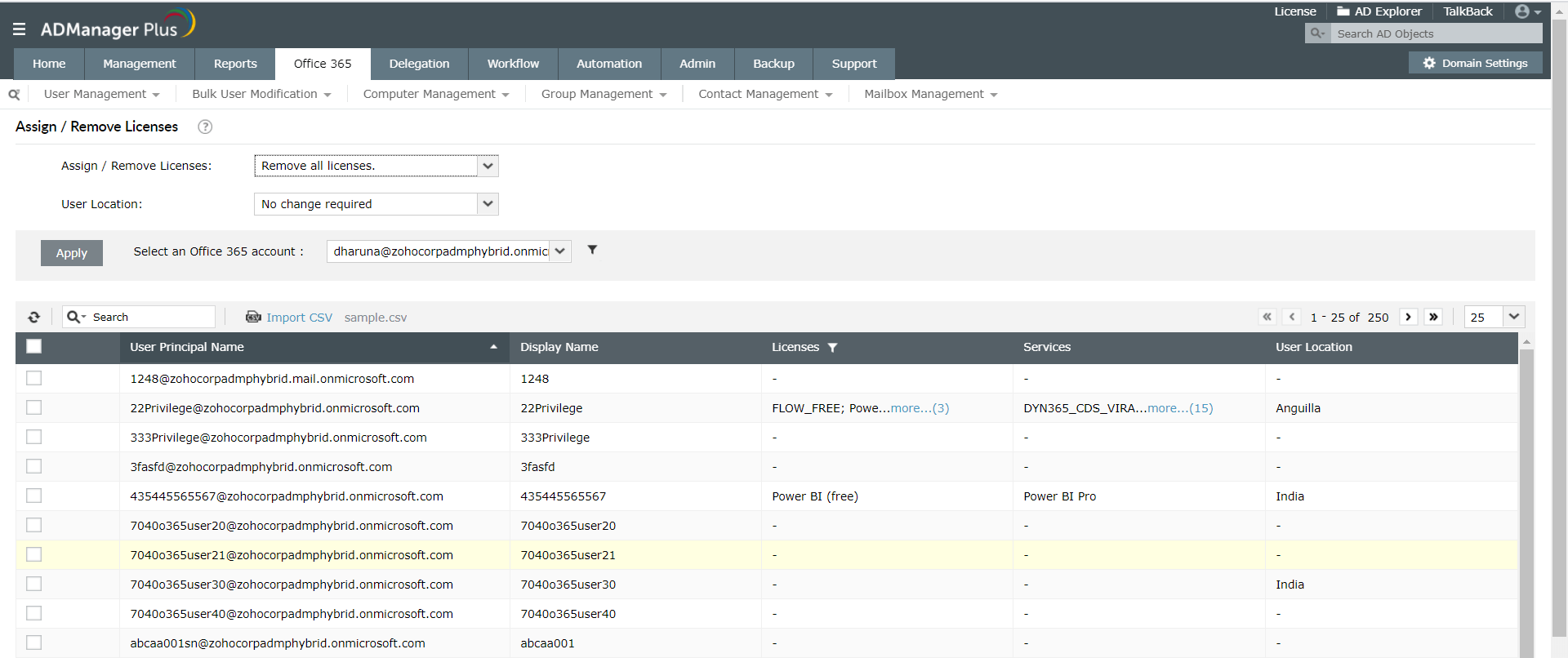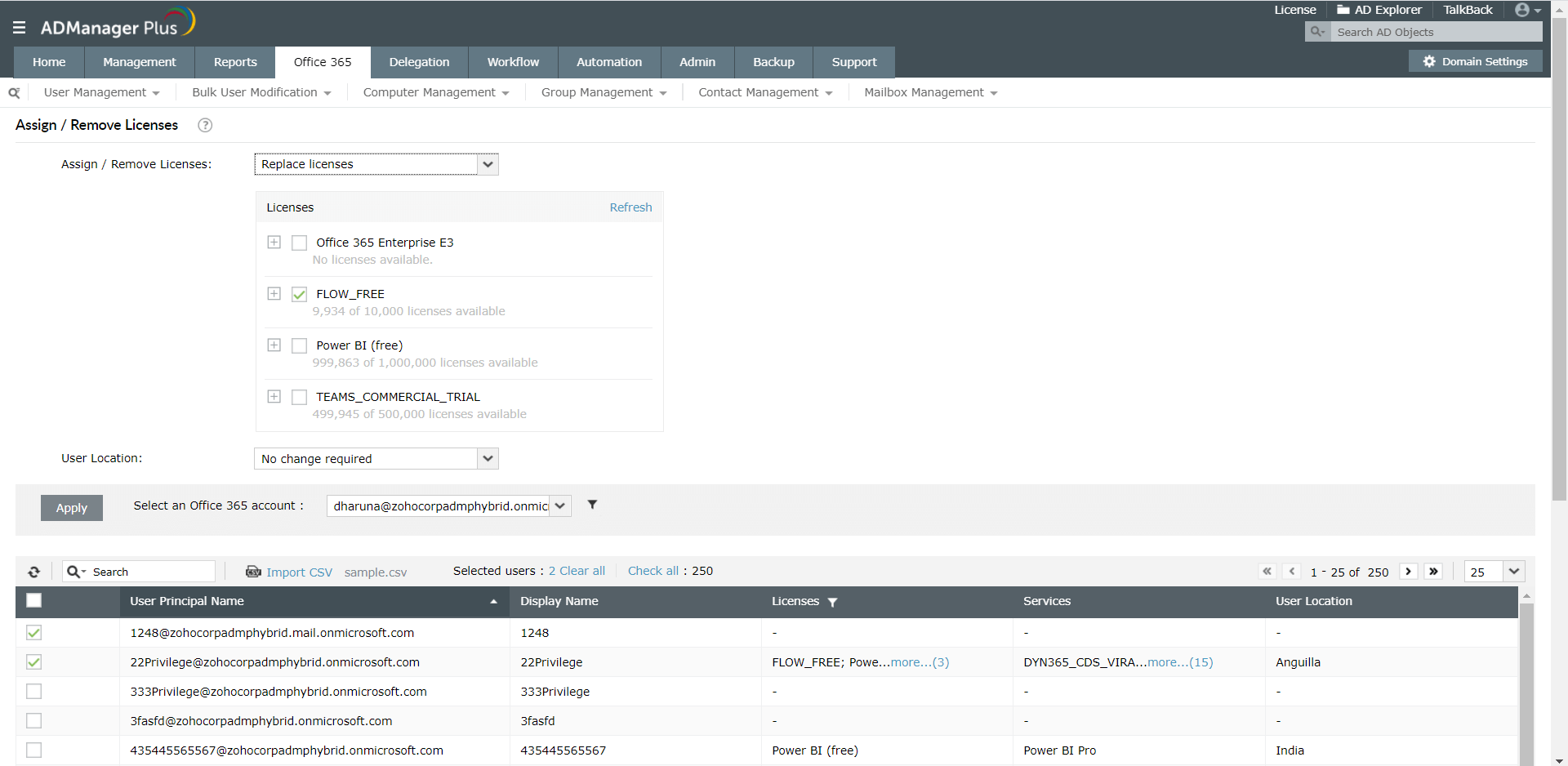 Les utilisateurs appartenant à un même groupe nécessitent généralement les mêmes fonctionnalités et, par conséquent, les mêmes licences. ADManager Plus vous permet de gérer facilement ces licences groupées en identifiant les utilisateurs concernés et en modifiant leurs licences en masse.Étapes pour attribuer ou révoquer les licences Microsoft 365 des utilisateurs avec ADManager Plus.
