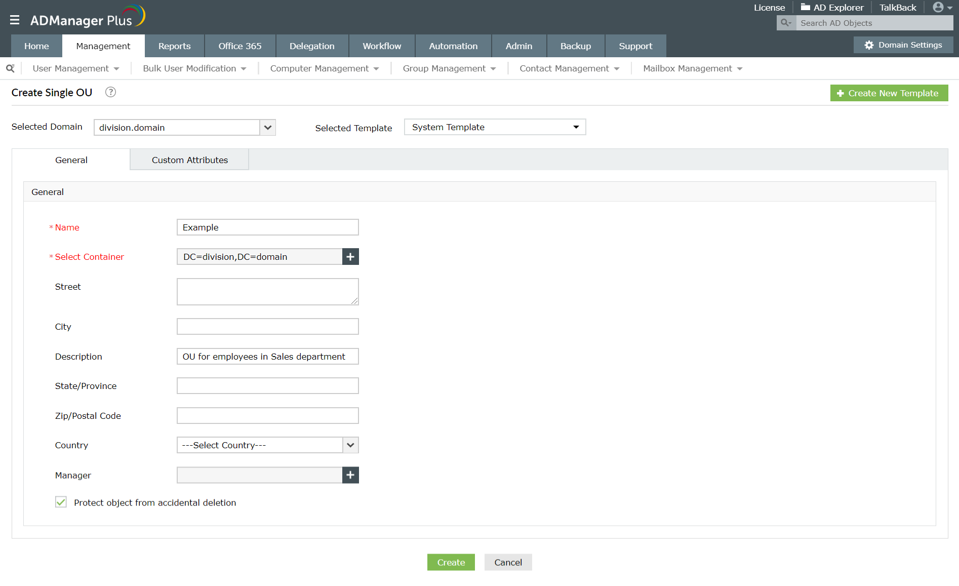 ADManager Plus vous permet d'effectuer la même chose en quelques clics à partir de sa console GUI basée sur le Web. Il dispose également d'options pour créer plusieurs UO simultanément à l'aide de modèles et en important un fichier CSV contenant les valeurs des attributs des UO. Vous pouvez en savoir plus à ce sujet ici.
