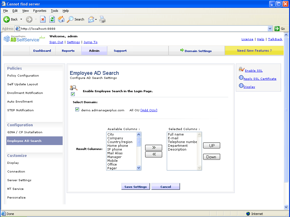 ADManager Plus dispose d'un « Chercheur de personnes » portable intégré. Avec ce « people finder », plus besoin d'un outil tiers pour rechercher des informations sur les utilisateurs dans Active Directory. La fonction de recherche d'employés d'ADManager Plus permet aux utilisateurs de connaître les détails de leurs collègues et des autres utilisateurs. La recherche avancée permet à l'utilisateur d'affiner sa recherche par adresse e-mail, téléphone, ville, etc. Les employés peuvent utiliser cette fonction sans se connecter à la console ADManager Plus. Cette option permet aux « employés sans identifiant de connexion » d'accéder à l'outil de recherche de personnes.Personnalisez l'outil de recherche de personnes en fonction de vos besoins :