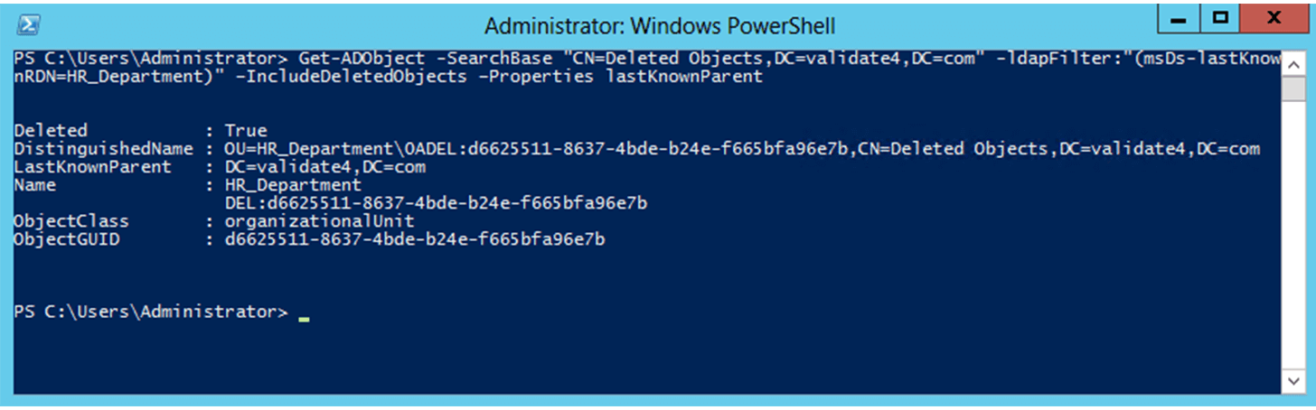 Get-ADObject -SearchBase "CN=Deleted Objects,DC= validate4,DC=com" -Filter {lastKnownParent -eq 'OU=HR_Department,DC= validate4,DC=com'} -IncludeDeletedObjects | Restore-ADObject