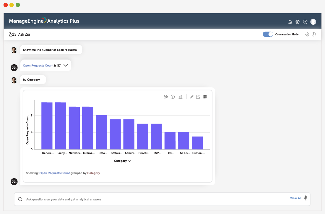 Oubliez les requêtes SQL complexes : il vous suffit de demander à Zia. Décrivez simplement ce dont vous avez besoin, à l’écrit ou à l’oral, et obtenez des insights instantanés. Approfondissez vos analyses, modifiez vos visualisations, découvrez corrélations et tendances en toute simplicité — le tout à travers une simple conversation.