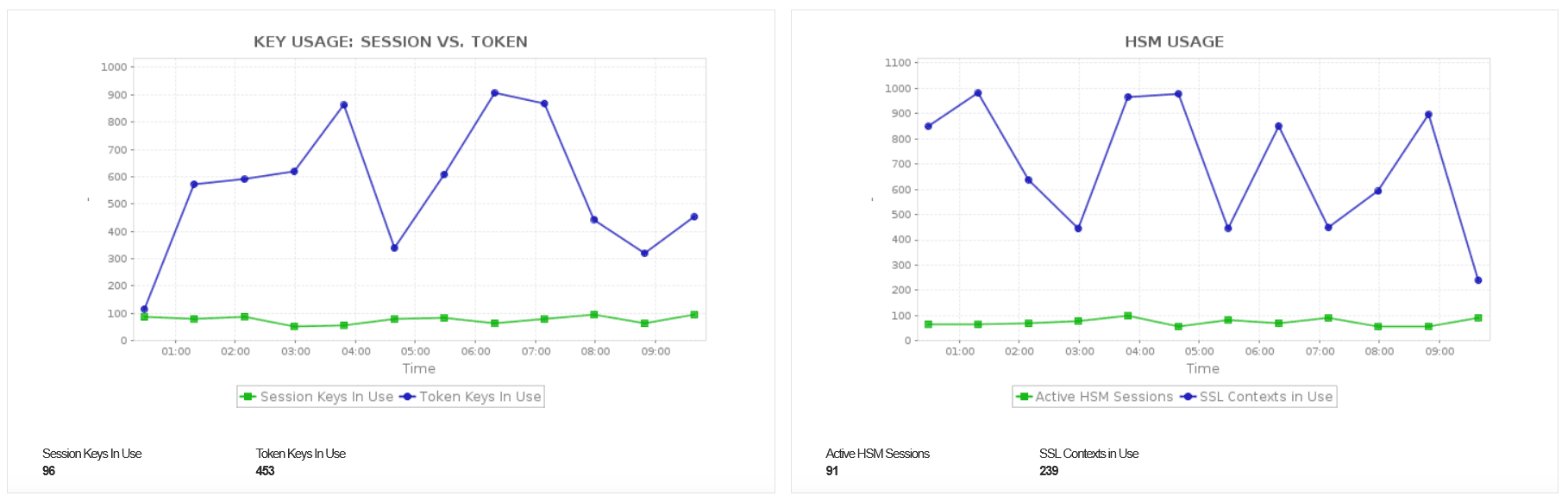 - Suivre les métriques d’utilisation clés comme la comparaison sessions et jetons pour savoir comment les clés de chiffrement sont utilisées et assurer une allocation de ressources correcte.