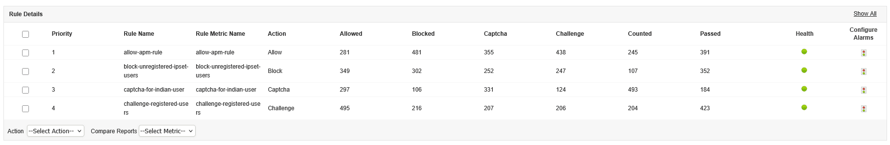 - Examiner les actions de demande par règle et type d’appareil client pour optimiser la performance. Des métriques basés sur des règles aident à détecter et prévenir les menaces en supervisant la fréquence à laquelle certaines règles sont activées, des métriques basés sur le client identifiant le trafic de bot et un comportement inhabituel des clients.