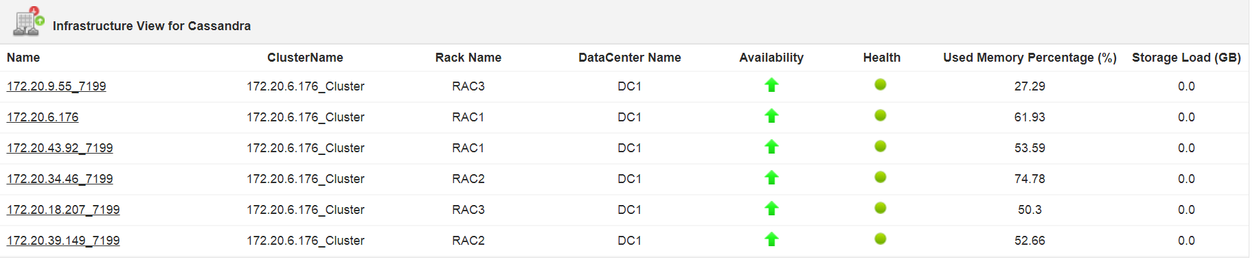 Vous pouvez surveiller en permanence les clusters de bases de données Cassandra avec le tableau de bord Applications Manager détaillant l'état d’intégrité, la disponibilité et les performances de tous les clusters surveillés. L’analyse des clusters Cassandra permet de récupérer des détails sur les nœuds actifs, sortants, déplacés, rejoignant et inaccessibles et surveille l’intégrité des nœuds au sein de chaque cluster.
