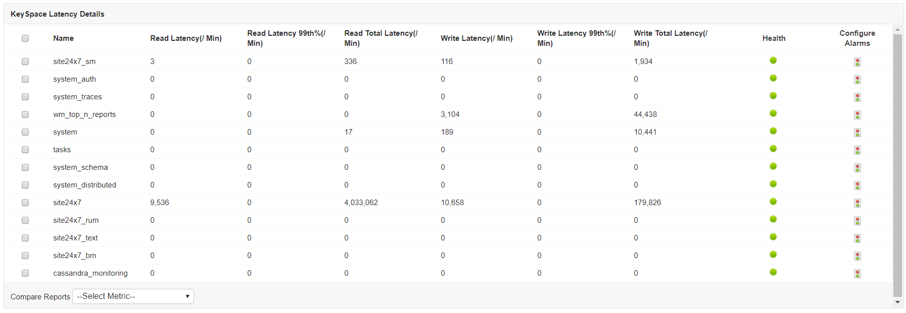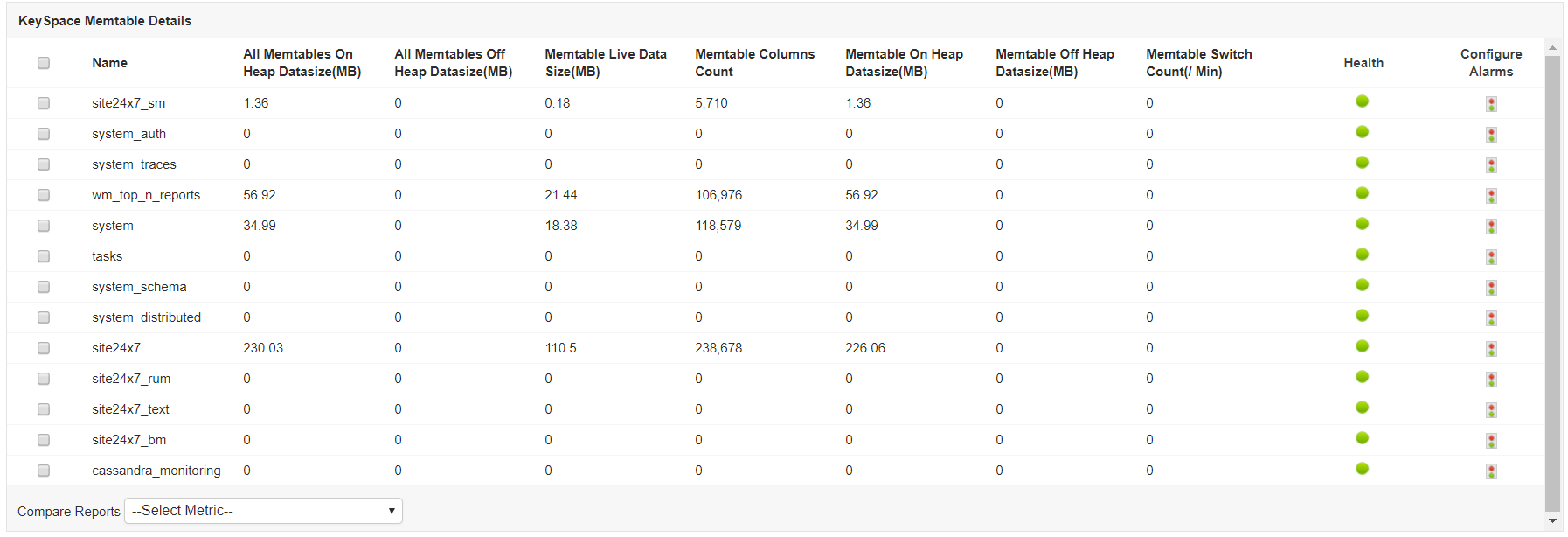 La solution de supervision Cassandra DB d'Applications Manager peut vous aider à obtenir un aperçu de la latence et des détails de la table mémoire pour chaque Keyspace. Il peut suivre divers paramètres tels que la latence de lecture, la latence d'écriture, les colonnes de la table mémoire, la taille du tas, le nombre de commutateurs et la taille des données en direct. Il peut également suivre les détails généraux de l'espace clé tels que l'espace disque actif utilisé, l'espace disque du filtre Bloom utilisé (Ko) et le résumé de l'index sur la mémoire du tas utilisée (Ko). Ces détails aident les administrateurs à optimiser les performances en ayant tendance à utiliser des espaces de clés avec une latence. Il peut également aider à identifier les tables de mémoire sur le point de débordement empêchant une panne potentielle.