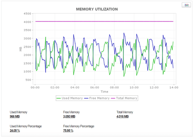 Les bases de données Cassandra consomment beaucoup de mémoire et des problèmes de performances des applications peuvent survenir si votre RAM n'est pas suffisante. Applications Manager surveille de près la consommation de mémoire de vos applications exécutées sur l'environnement Cassandra et affiche la mémoire utilisée, libre et totale du serveur en mégaoctets.
