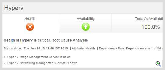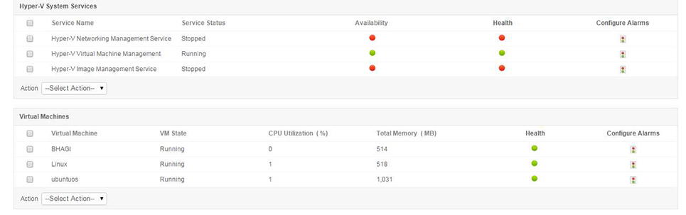 Supervisez la disponibilité et l'état des services Hyper-V critiques tels que le service de gestion d'images Hyper-V, la gestion de machine virtuelle et le service de gestion de réseau. Les administrateurs peuvent également activer, désactiver ou supprimer ces services depuis Applications Manager lui-même.