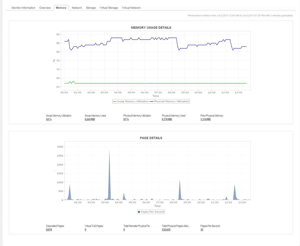 Évitez le problème des serveurs Hyper-V à court de mémoire. Soyez averti lorsque l'utilisation de la mémoire est élevée ou que la mémoire devient extrêmement faible. Les mesures suivies comprennent la mémoire d'échange, la mémoire physique, la mémoire physique libre, les pages déposées, les pages TLB virtuelles, le nombre total de pages physiques distantes, etc.