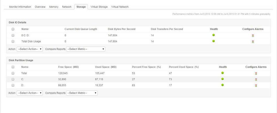 Obtenez une idée des performances globales du disque du système Hyper-V ainsi que pour chaque machine virtuelle. Découvrez à quel point les disques sont occupés ou si les disques sont saturés. Les mesures incluent la longueur actuelle de la file d'attente du disque, les octets de disque par seconde, les transferts de disque par seconde, etc.
