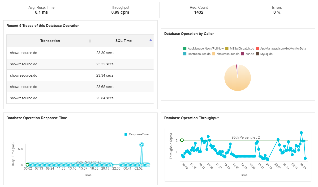 Affichez des indicateurs de performance détaillés pour identifier les appels de base de données lents, vérifier l’utilisation et l’efficacité globale grâce à des graphiques et des tableaux précis. Une liste des transactions Web qu’effectue une base de données aide à affiner et isoler la cause première d’un ralentissement.