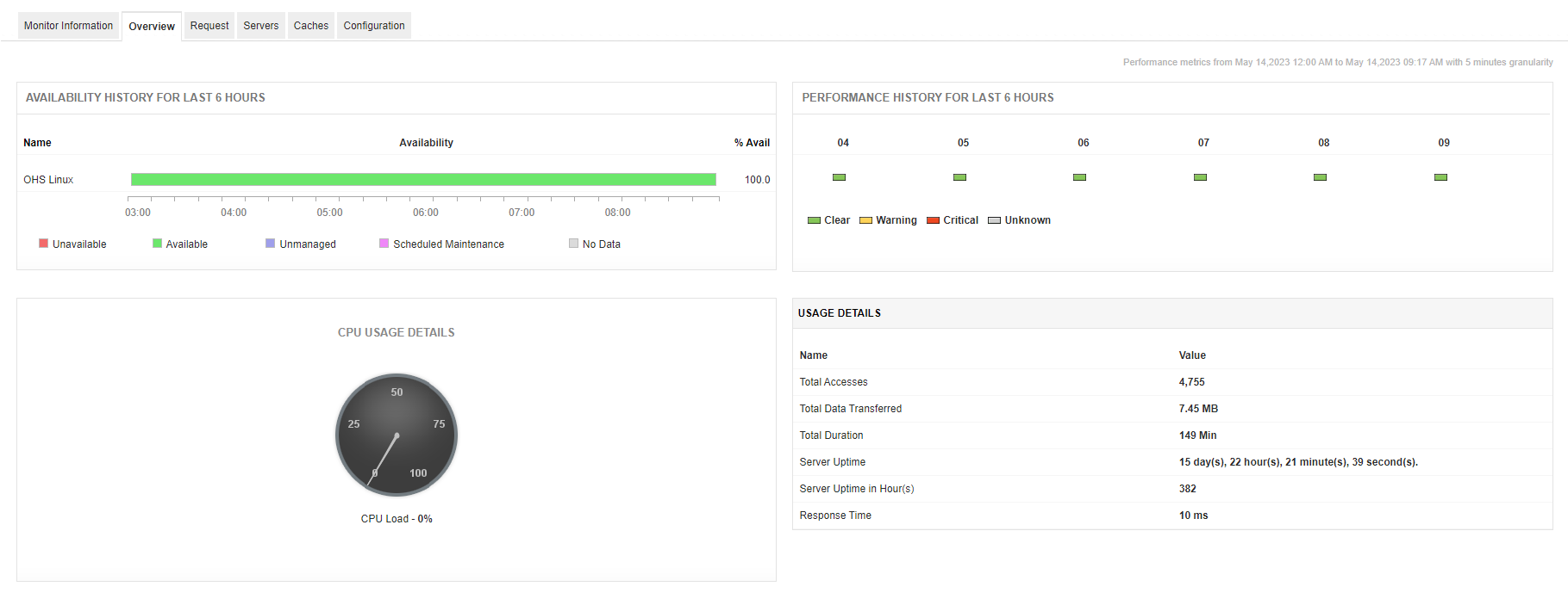 La surveillance des performances de votre serveur web est essentielle pour garantir le bon fonctionnement des applications web de votre entreprise. L'outil de surveillance du serveur HTTP Oracle d'Applications Manager vous permet de suivre en temps réel les principales métriques de performance de votre serveur HTTP Oracle, tout en fournissant des analyses approfondies pour améliorer l'expérience utilisateur.
