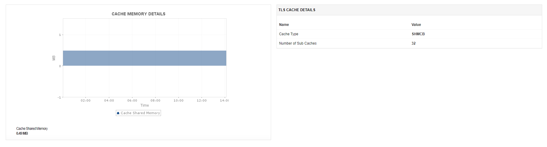 Surveillez l'utilisation des caches de session TLS stockés par vos serveurs web. Suivez la quantité de caches utilisés, le nombre d'entrées stockées et celles expirées pour le serveur. Consultez les détails sur la mémoire cache partagée allouée aux sessions TLS, le type de cache utilisé, ainsi que le nombre de sous-caches employés par le serveur web pour stocker les entrées.