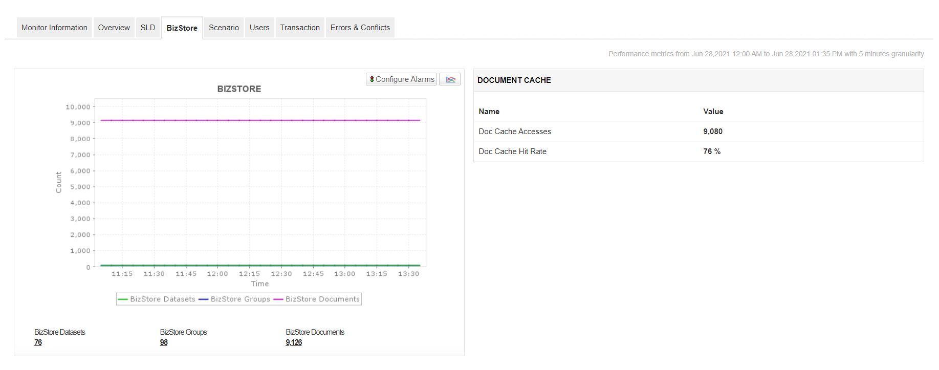 Le BizStore est une couche de persistance où sont stockés tous les documents pertinents liés au cadre d'intégration et aux scénarios créés. Applications Manager surveille diverses métriques liées au BizStore, telles que le nombre d’ensembles de données, de groupes et de documents disponibles. Ces informations permettent de suivre efficacement l’état et la disponibilité des ressources dans le BizStore. Obtenez des informations sur le taux d'accès au cache du document et analysez-le afin d'améliorer la vitesse et les performances.