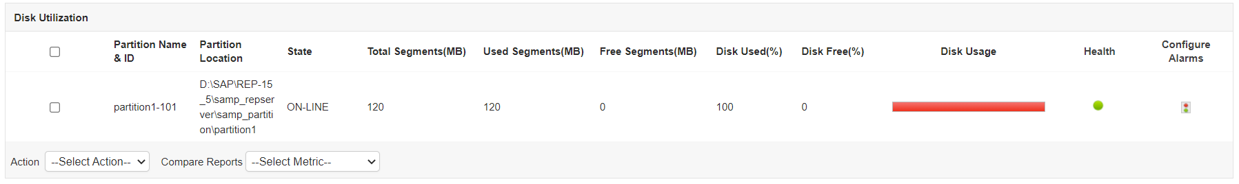 Les serveurs de réplication Sybase utilisent des disques divisés en plusieurs partitions. Grâce à l’outil de surveillance Sybase Replication d’Applications Manager, vous pouvez identifier l’ensemble des partitions existantes et consulter à la fois le pourcentage d’espace occupé et celui encore disponible. Cette visibilité vous permet d’évaluer précisément la capacité de stockage de vos serveurs de réplication et d’anticiper leurs besoins en ressources.