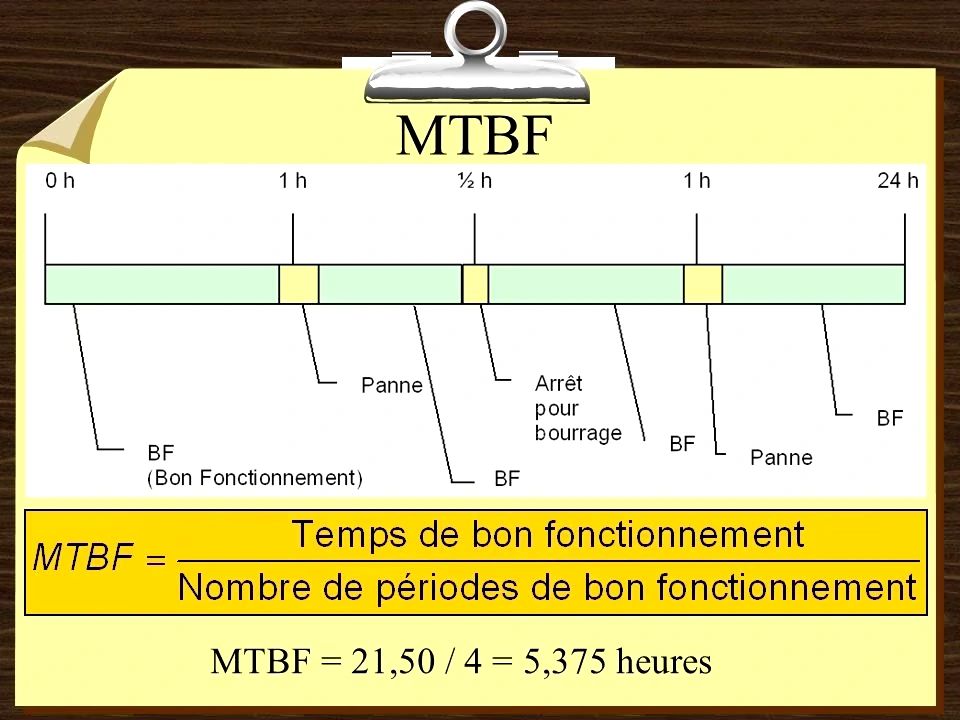 Prenons un exemple concret : un système fonctionne pendant 21,50 heures et subit 4 pannes. Son MTBF est donc de 5,375 heures. Cela signifie qu’en moyenne, une panne survient toutes les 5,375 heures.