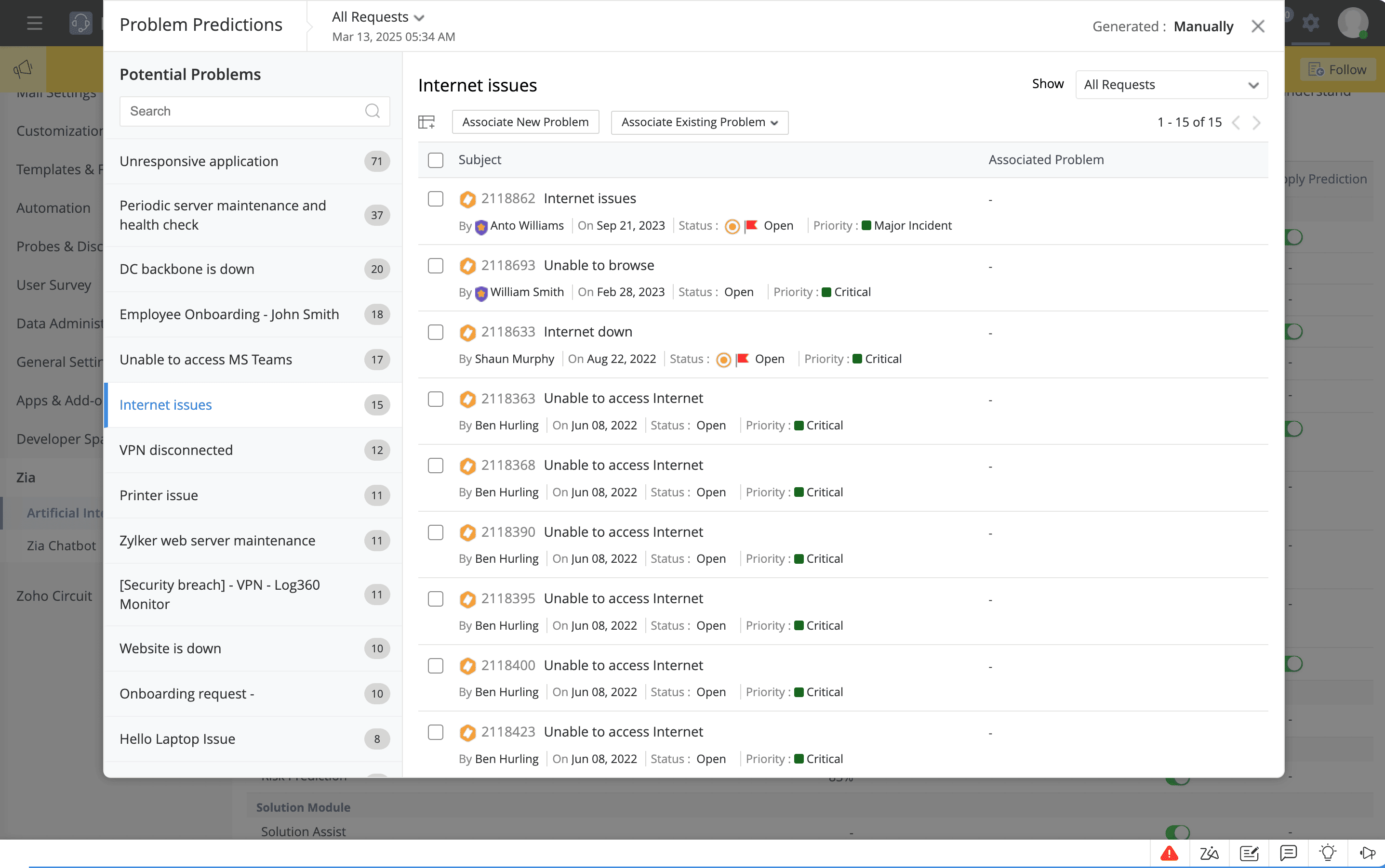 Zia Problem Prediction (prédiction de problèmes de zia ) analyse automatiquement les tickets pour identifier des schémas récurrents et détecter les incidents partageant une cause commune. Dès qu’un seuil critique est atteint, Zia envoie une alerte proactive, permettant aux techniciens d’identifier le problème sous-jacent avant qu’il ne génère une vague d’incidents. Cette fonction aide également à catégoriser les priorités afin que les équipes puissent traiter en premier les tickets les plus critiques et empêcher l’escalade des incidents.