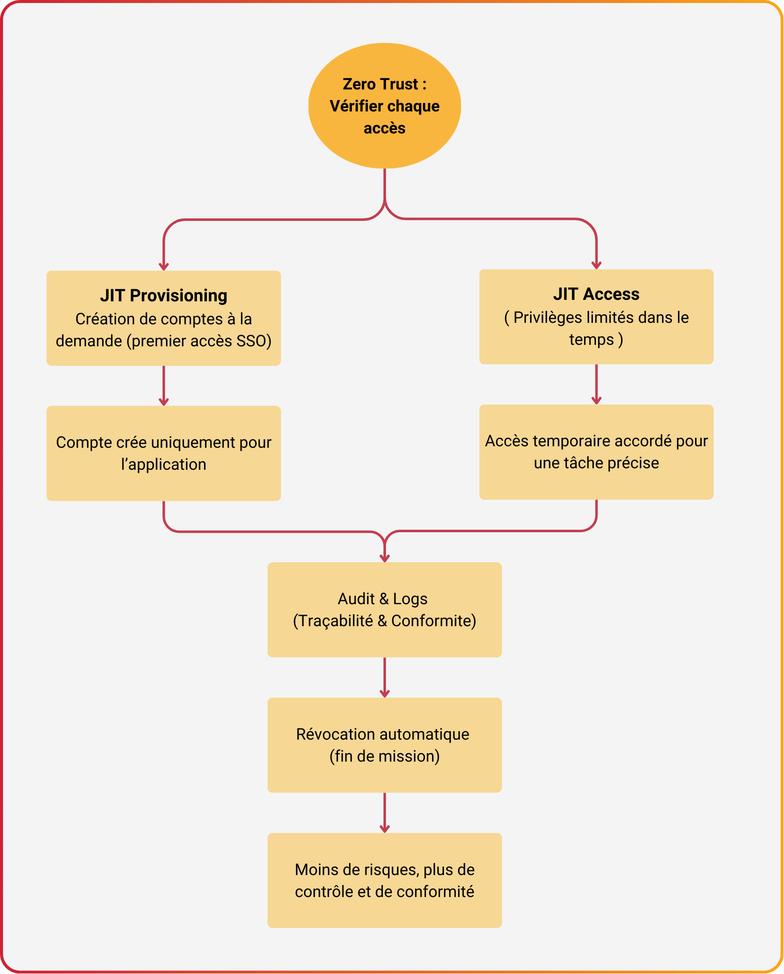 Ces deux mécanismes se complètent : le provisionnement JIT assure la création sécurisée des comptes, tandis que l’accès JIT contrôle l’usage temporaire des privilèges.