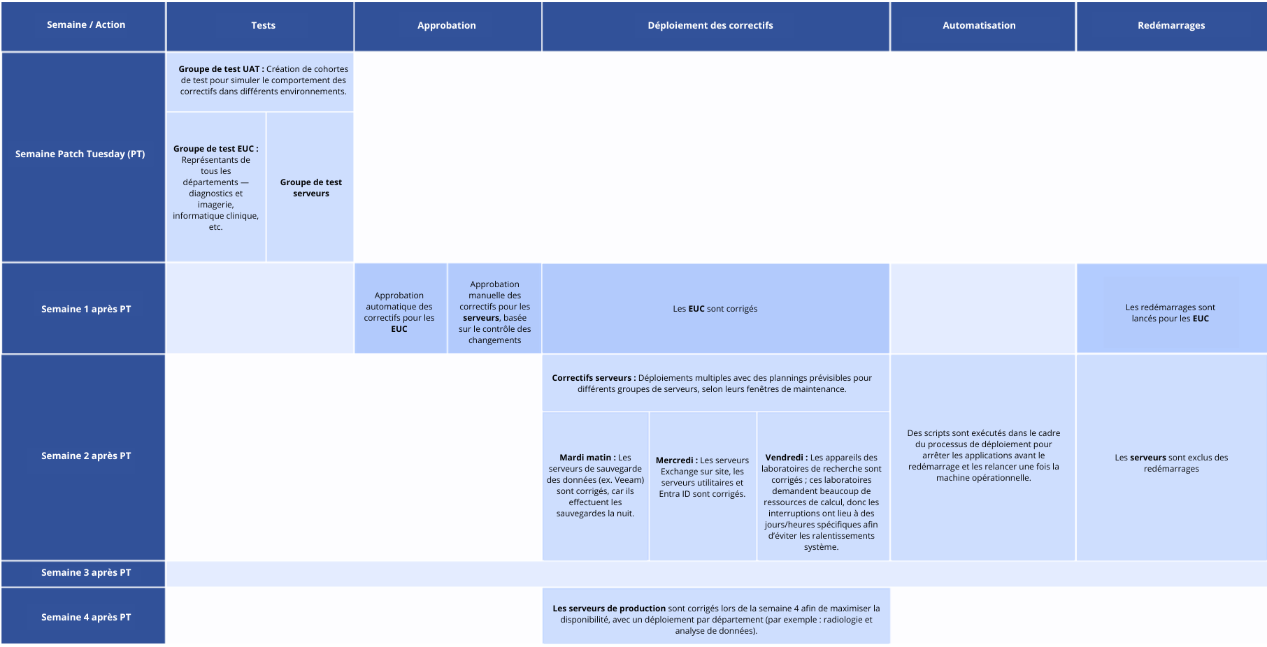 C’est là que la conformité devient difficile à assurer sans perturber les flux de soins. Une grande organisation de santé suit généralement un calendrier de correctifs rigoureux, adapté à la diversité de ses équipements, comme illustré ci-dessous.