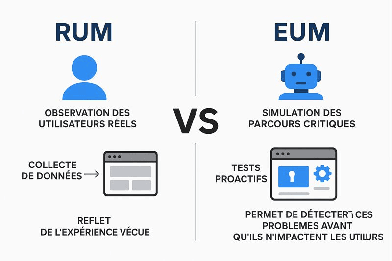 Bien que proches dans leur objectif, surveiller l’expérience utilisateur, RUM et EUM jouent deux rôles distincts et parfaitement complémentaires. D’un côté, le RUM fournit une observation passive de l’expérience réelle, telle qu’elle est vécue par les utilisateurs finaux. De l’autre, l’EUM repose sur des tests actifs qui vérifient en continu la disponibilité et la performance des parcours critiques.