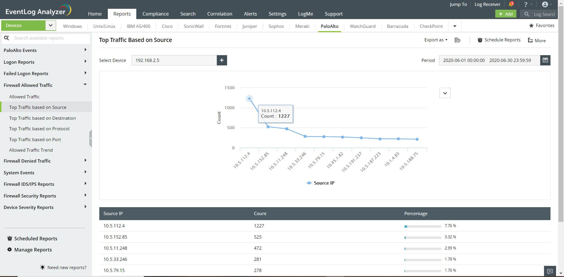 Les pare-feux contrôlent tout le trafic entrant et sortant d'un réseau. Ils sont ainsi le sujet idéal des outils d'audit qui peuvent surveiller et analyser le trafic réseau. EventLog Analyzer analyse les données des pare-feux et montre quels utilisateurs essayent d'accéder au réseau de l'organisation. Avec les modèles et les tendances de trafic, il peut aussi améliorer la compréhension du réseau et guider les stratégies de pare-feu.