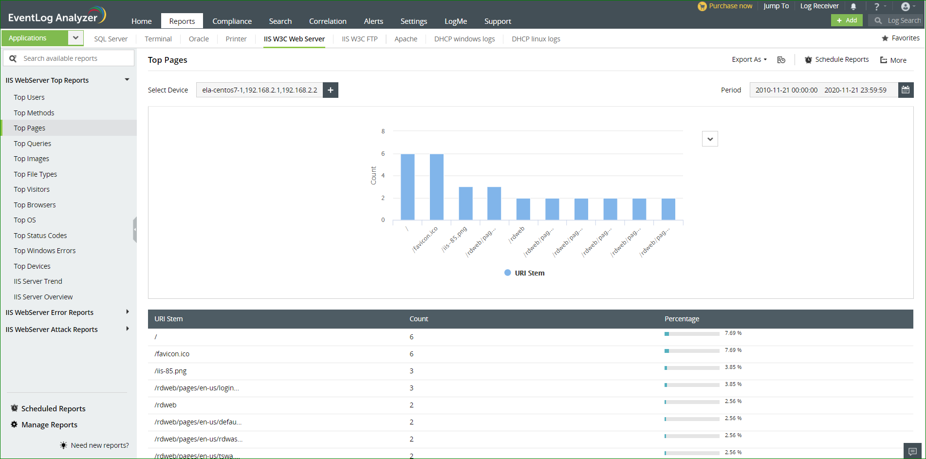 EventLog Analyzer est une solution puissante pour surveiller les journaux des serveurs Web, y compris les journaux des serveurs IIS, les journaux des serveurs Apache et les journaux des serveurs DHCP. L'outil d'analyse et de reporting des journaux de cette application fournit des alertes en temps réel pour les attaques DoS, les scripts intersites et autres attaques similaires visant les serveurs web IIS et Apache, afin de permettre une mitigation rapide des attaques de sécurité des applications web. Il effectue une analyse efficace des journaux des applications des serveurs web et fournit des rapports détaillés sur les erreurs HTTP survenant sur le serveur web, les attaques de sécurité, les requêtes URL malveillantes, et bien plus encore.