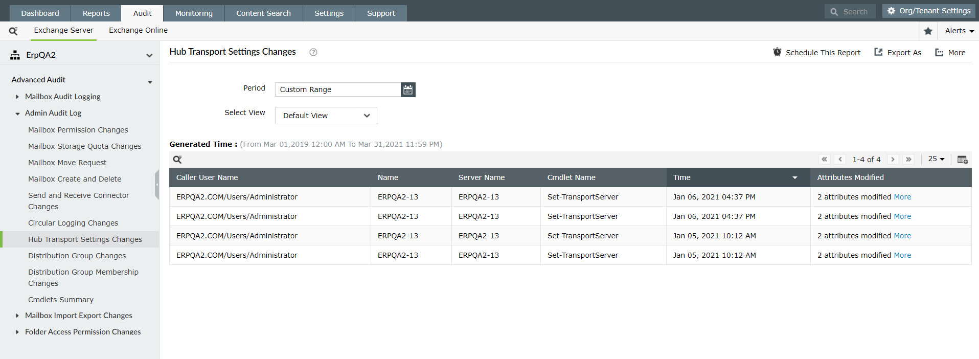 Auditez toutes les modifications effectuées par vos administrateurs grâce aux rapports d'audit d'administration d'Exchange Reporter Plus.