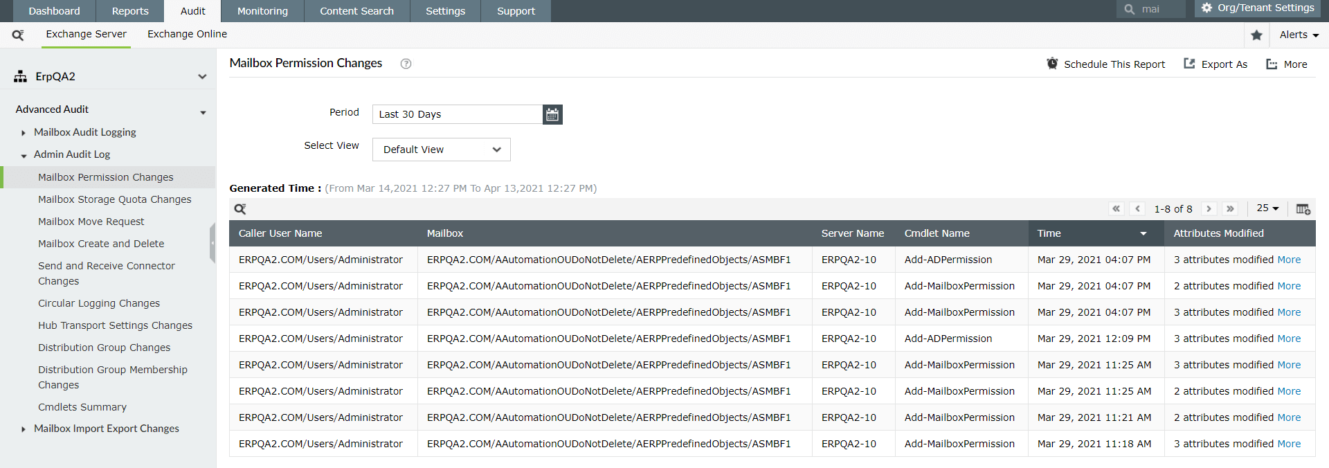 Exchange Reporter Plus propose des rapports détaillés pour suivre, auditer et documenter toutes les modifications des autorisations des boîtes aux lettres au sein des domaines Exchange. Étant donné que ces autorisations constituent une porte d'accès aux informations sensibles, un contrôle régulier est essentiel pour s'assurer que seuls les délégués autorisés disposent des permissions d'envoi en tant que et d'accès complet aux boîtes aux lettres. Grâce à une surveillance continue et à un système d'alertes, toute modification des autorisations des boîtes aux lettres est immédiatement portée à l'attention de l'administrateur. Les rapports incluent :