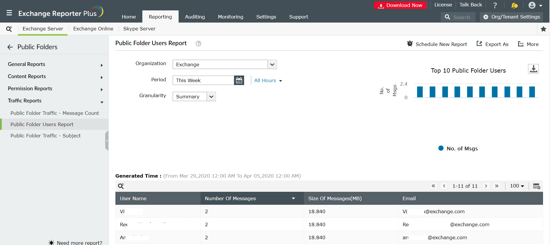 Exchange Reporter Plus vous propose des rapports exhaustifs sur les dossiers publics, fournissant des informations précises sur des aspects essentiels tels que la hiérarchie des dossiers publics, les autorisations administratives, les autorisations client, et bien plus encore. Cet outil de reporting est compatible avec les plateformes Microsoft Exchange suivantes : Exchange Server 2003, 2007, 2010, 2013, 2016, 2019 et Exchange Online.