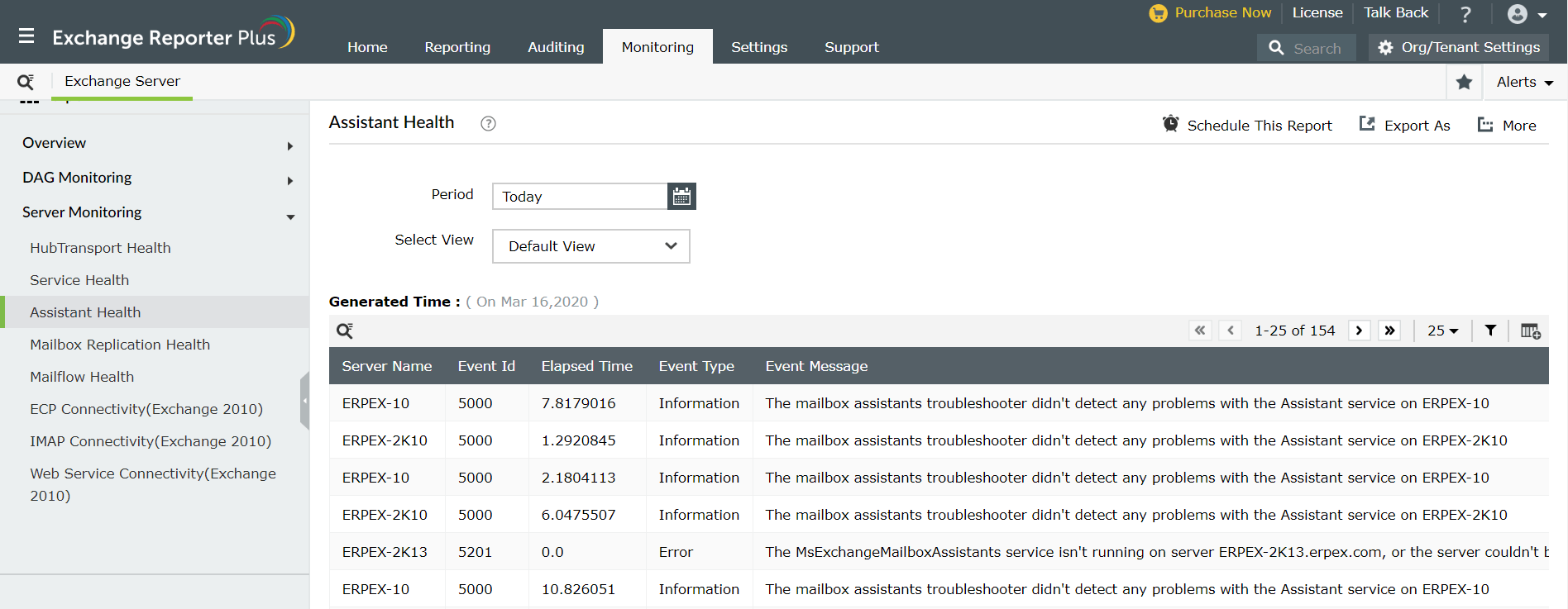Téléchargez ces rapports de bilan de santé des serveurs Exchange dans des formats variés, notamment CSV, XLS, HTML et PDF. Vous pouvez également programmer leur génération automatique et les recevoir directement par email. Pour en savoir plus sur les rapports de surveillance proposés par Exchange Reporter Plus de ManageEngine, ici.