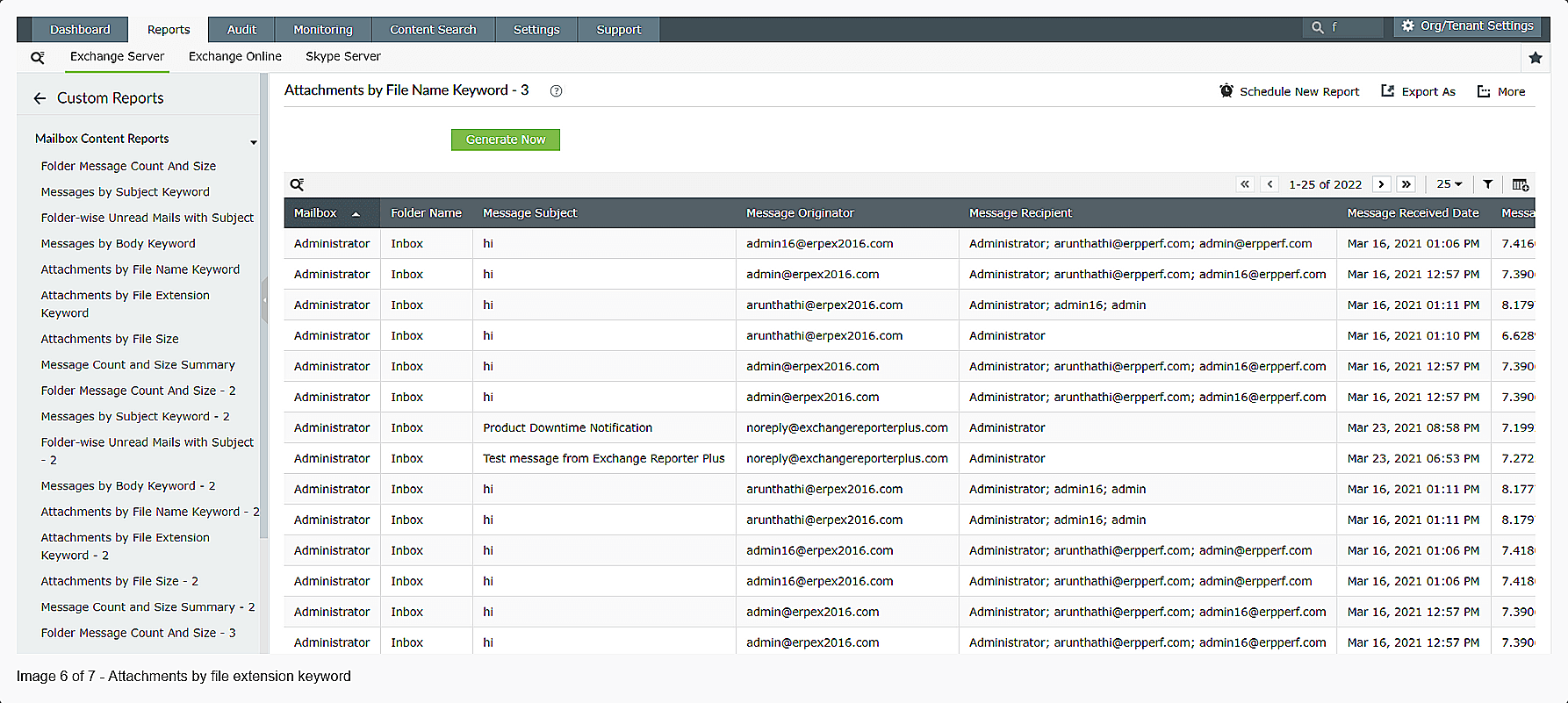Vérifiez des messages de l’organisation selon un mot-clé particulier dans les lignes d'objet avec ce rapport. Isoler les messages de spam devient plus facile, car ils présentent des sujets/mots-clés similaires comme loterie ou marketing. Identifiez ces messages pour éviter qu'ils ne provoquent des dommages à l'infrastructure Exchange de l’organisation.