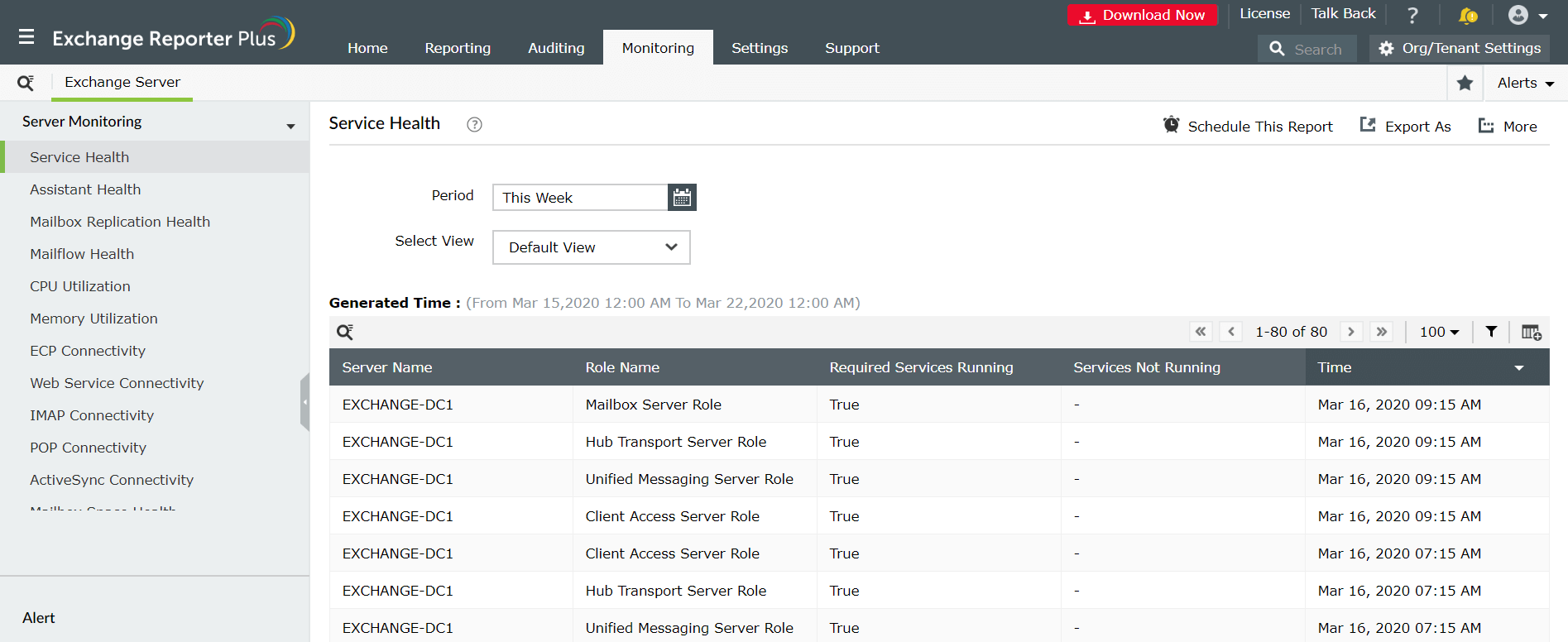 Analysez l’intégrité des services Exchange Server en surveillant tous les rôles disponibles par serveur de boîtes aux lettres et leurs états (en cours d'exécution ou pas). Vous pouvez aussi recevoir des alertes en temps réel si un service donné arrête de fonctionner. Le rapport permet également d’analyser la performance du serveur.