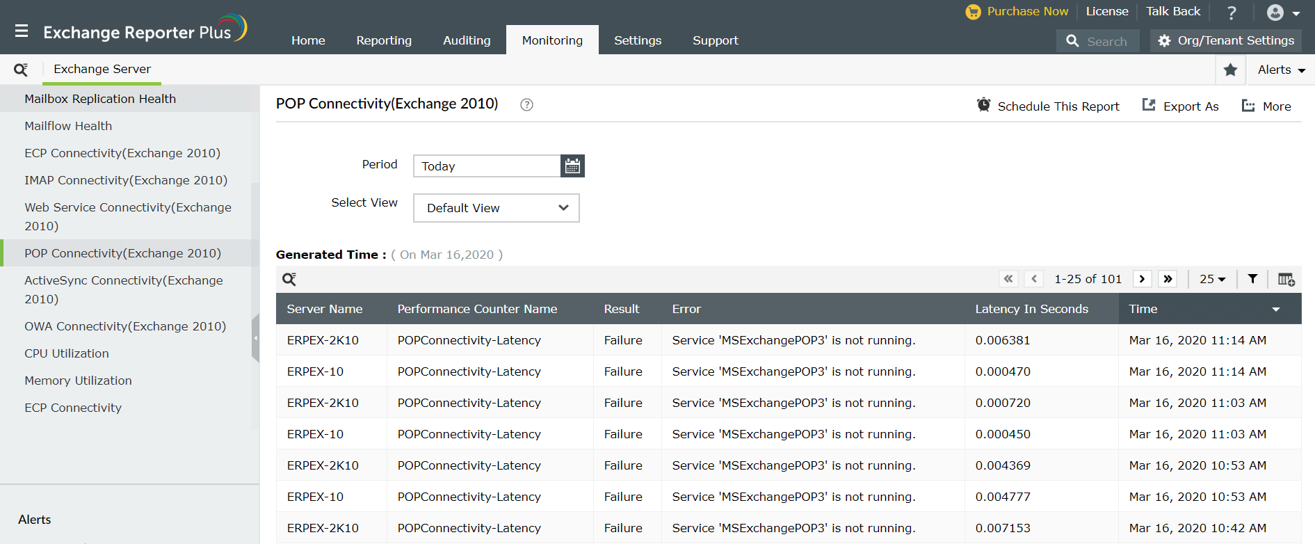 Analysez et vérifiez le service Exchange Online avec Exchange Reporter Plus.
